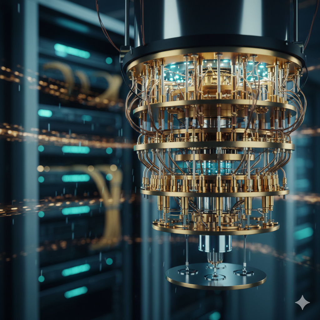 Detailed view of a golden quantum computing chandelier inside a data center, representing the scalability of Quantum-as-a-Service (QaaS) infrastructure.