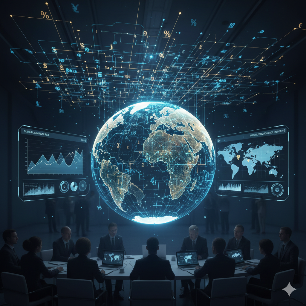 Conceptual visualization of global fiscal cooperation and data connectivity representing the unified tax standards of 2026.